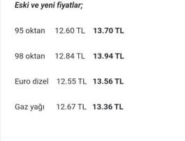 Bir önceki fiyatlandırmada 12.60 olan 95 oktan benzinin litresi 13,70’e, 12.84 olan 98 oktan benzin 13 94’e, 12.55 olan euro dizel 13.56’ya ve 12.67 olan gaz yağı 13.36’ya yükselecek.